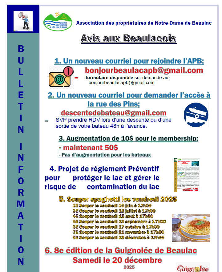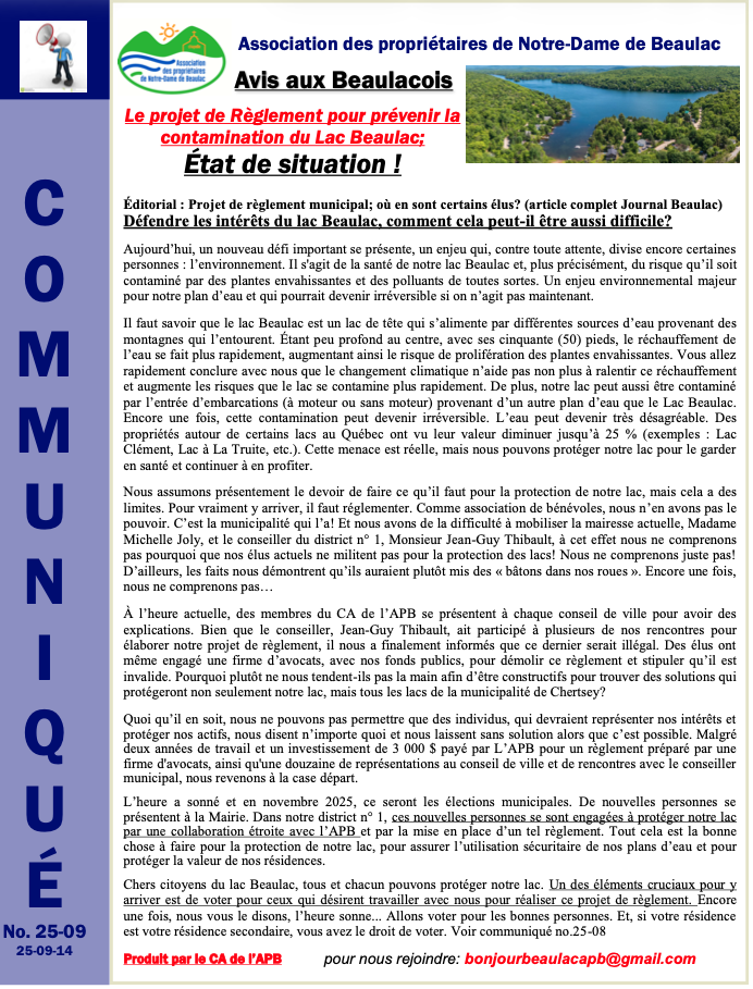 Depuis près de 2 ANS L’APB (Association des Propriétaires de Notre-Dame de Beaulac) travaille sur un projet de règlementation sur la mise à l’eau des embarcations motorisées et non motorisées dans un but environnemental.